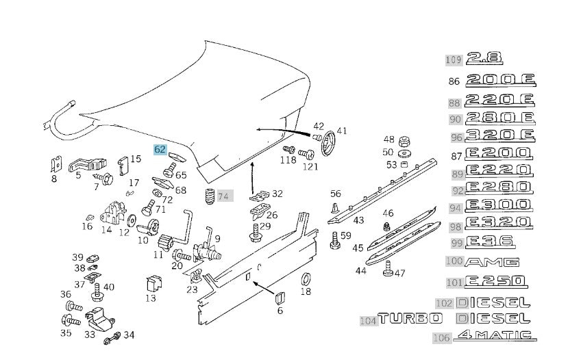 Wir bieten für Mercedes-Benz W124 Sedan, Coupé oder Cabrio einen neuen Anschlag für den Heckdeckel links oder rechts .