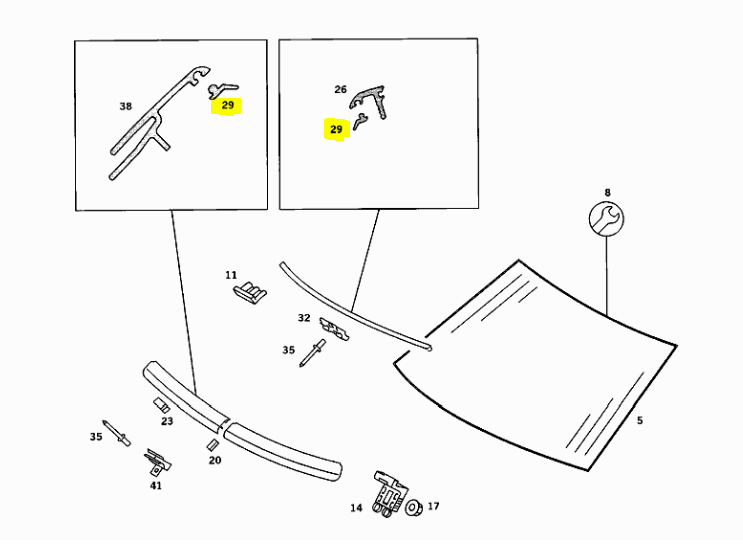 Wir bieten für Mercedes Benz W201 190D 190E Limousine zwei neue Abdichtungen / Unterlagegummis jeweils unterhalb und oberhalb der Windschutzscheibe .