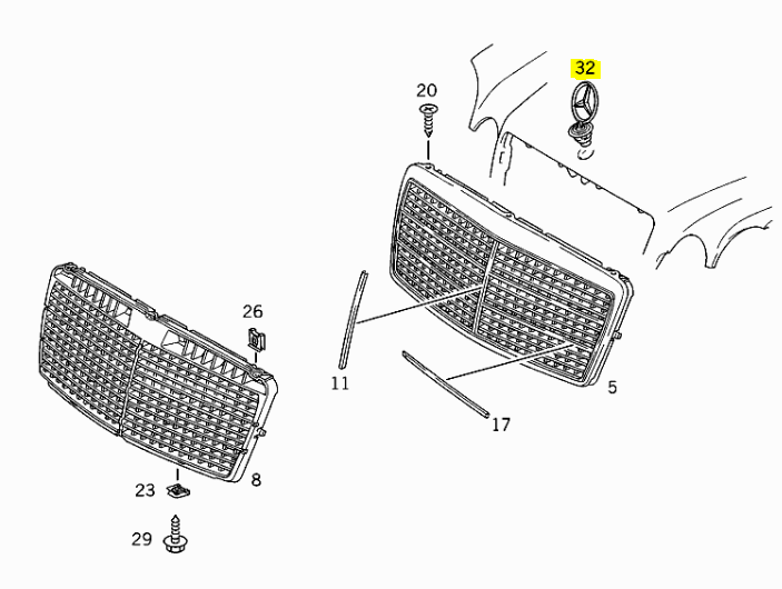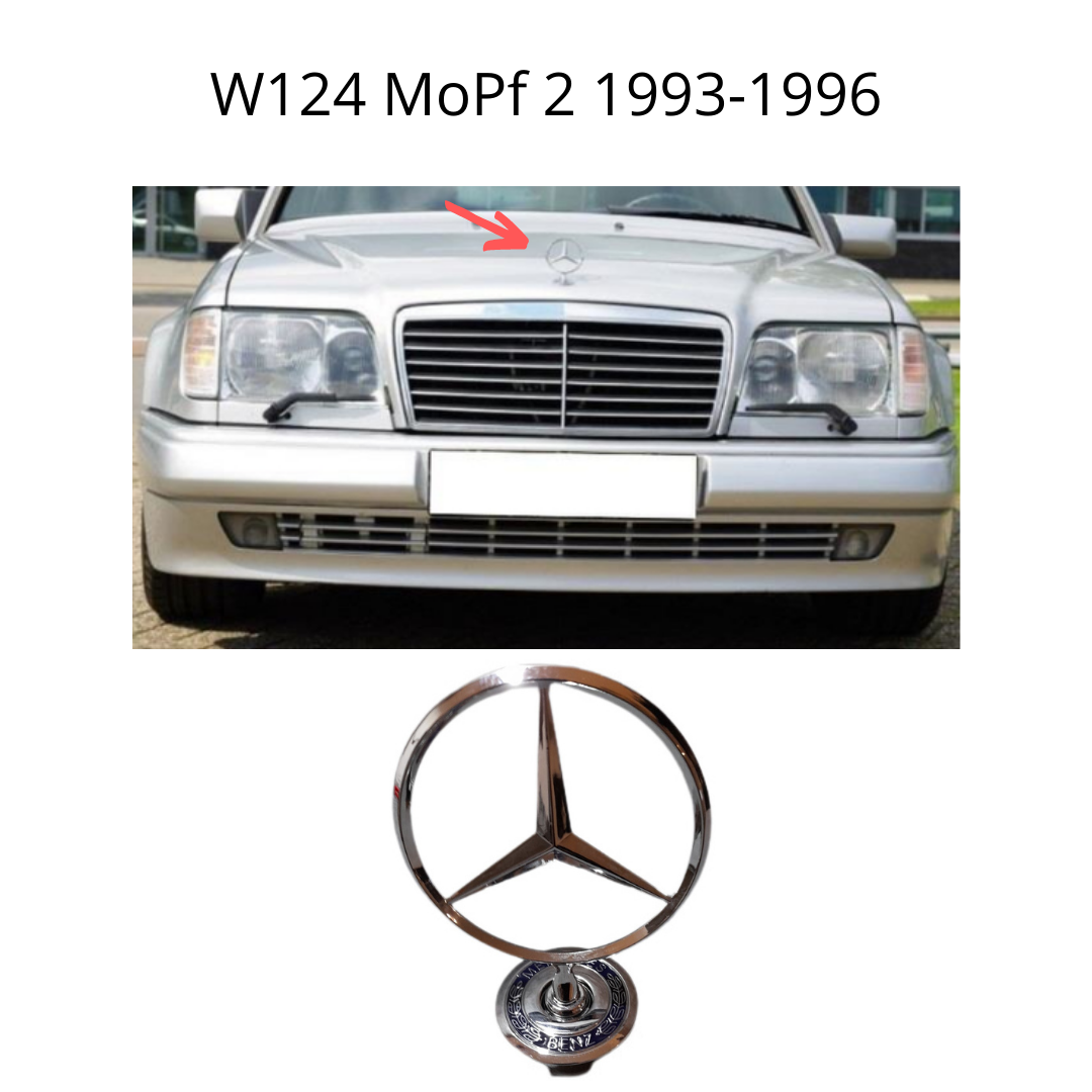 Wir bieten für Mercedes Benz W124 Sedan, T-Modell und Coupé Stern Emblem aus Chrom für die Motorhaube.